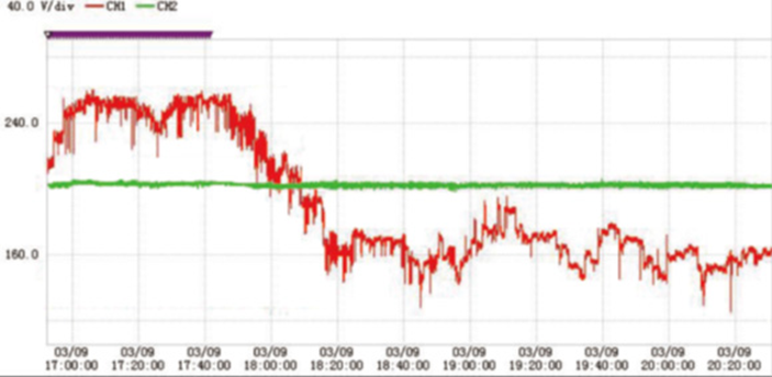 低電壓治理效果:紅色為輸入電壓(治理前電壓),綠色為輸出電壓(治理后電壓)。治理前電壓最高近250V,最低140V,電壓波動頻繁,治理后電壓一直穩(wěn)定在220V左右,治理效果明顯。