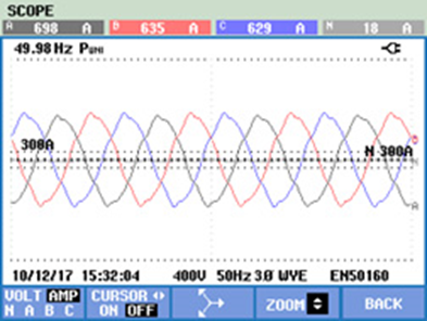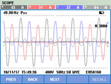 從測試數據看出,變壓器低壓側電流波形發生嚴重畸變,中線電流也很大;各樓層配電箱中線電流達到相線兩倍,已經觸及中性線電纜載流限制,存在嚴重安全隱患。